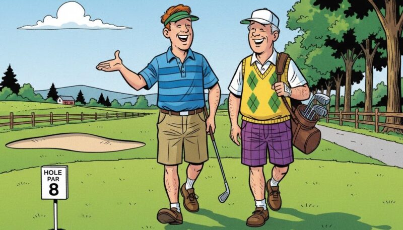 Two guys are out on the golf course on a bright Saturday morning, chatting and laughing as they move from hole to hole.