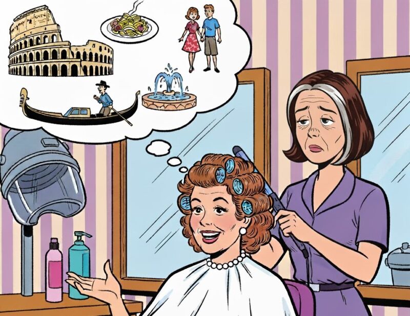“Continental?” exclaimed the hairdresser. ” That’s a terrible airline. Their planes are old, their flight attendants are ugly and they’re always late. So where are you staying in Rome?”