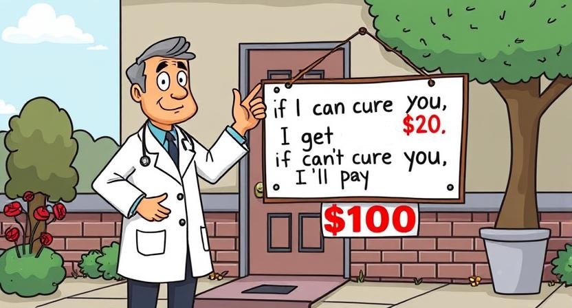 The sign reads, “If I can cure you, I get $20. If I can’t cure you, I’ll pay you $100”.