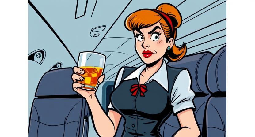 The stewardess, flustered by the parrot’s outburst, brings back a whisky for the parrot…