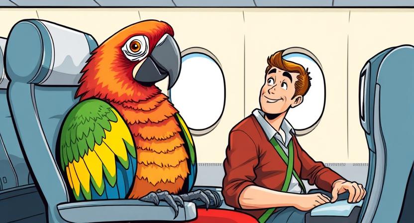 Upon reaching his plane seat, a man is surprised to see a parrot strapped into the seat next to him…