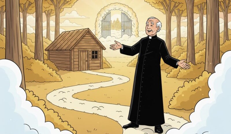 “Father Mulgrew, we’ve been expecting you,” says the saint. “Please go with this angel. We’ve got you a lovely little retirement shack on the edge of the woods. It’s a humble little place but I promise you will be comfortable, and there is a beautiful lake view just an hour’s walk away – and of course, this is Heaven so walking for an hour won’t tire you in the slightest.”