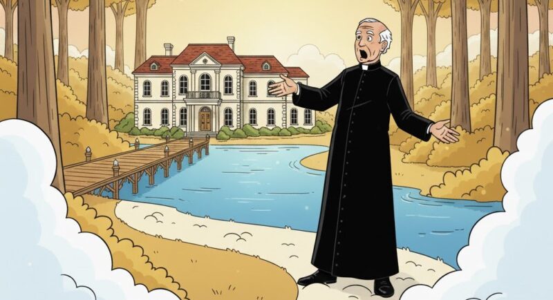 The priest goes away, settles in, and pretty soon he takes the recommended walk and he finds the beautiful lake view. But he sees something that his Heaven-granted sight – no longer his Earthly eyes dimmed by eighty years of age – discerns clearly enough for him to be puzzled and even a little disturbed.