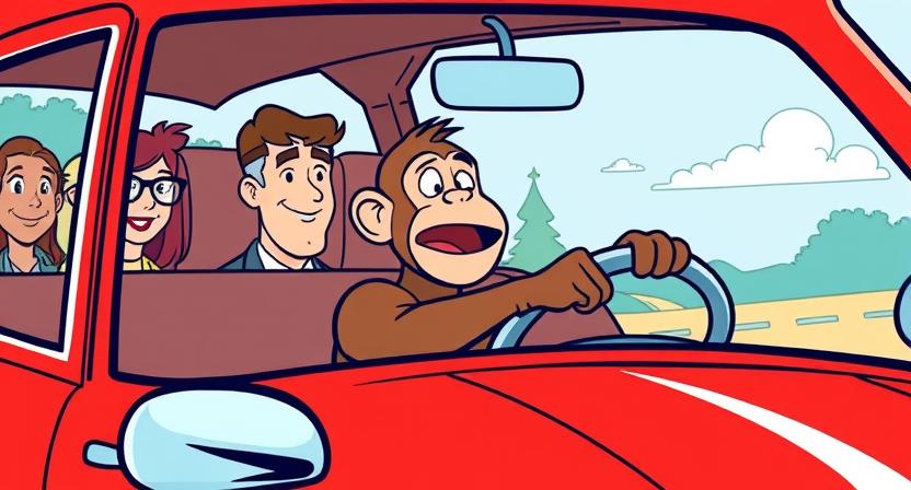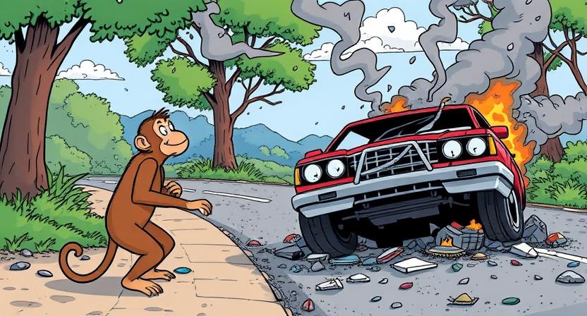 As he looks upon the wreckage a little monkey comes out of the brush and hops around the wreckage…