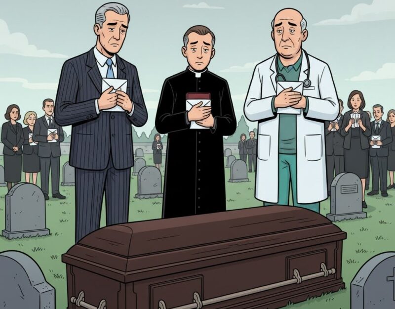 All three agreed to do this and were given the money. At the funeral, each approached the coffin in turn and placed an envelope inside.