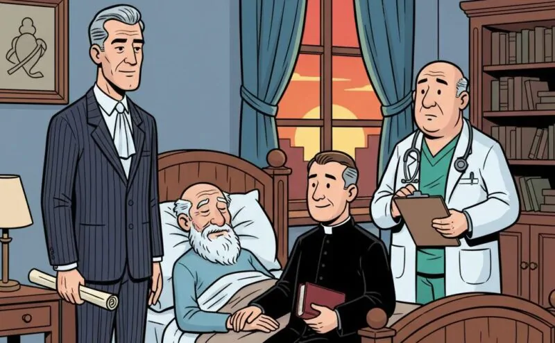 As Mr. Smith was on his death bed, he attempted to formulate a plan that would allow him to take at least some of his considerable wealth with him. He called for the three men he trusted most – his lawyer, his doctor, and his clergyman.