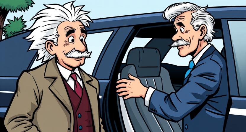 Noticing that his driver looks a lot like him, Einstein says, “That’s a great idea.