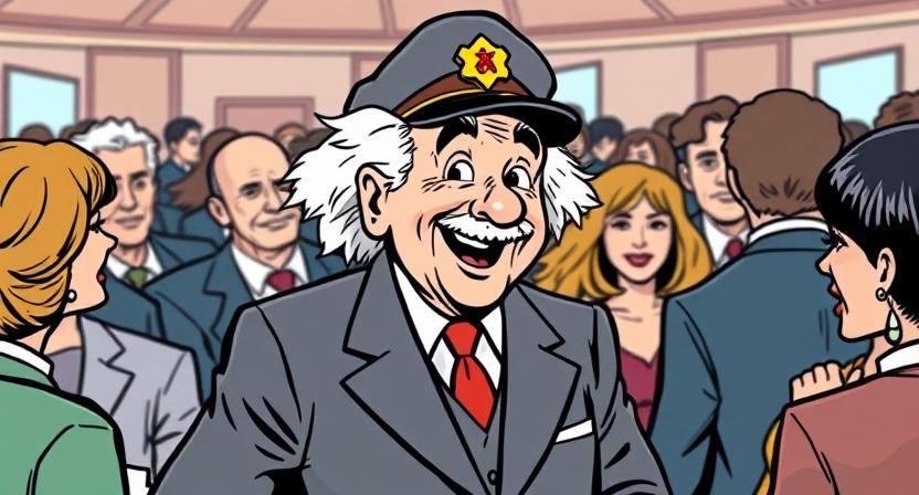 As soon as they arrive, the driver goes on stage and starts giving the usual speech while the real Einstein attends it.