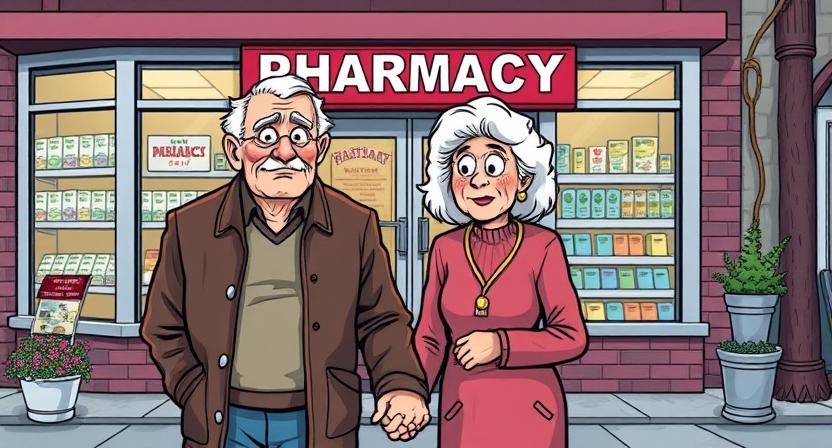 They go for a stroll to discuss the wedding, and on the way, they pass a pharmacy.