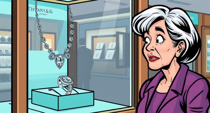 A lady spots a beautiful diamond necklace at Tiffany & Company and walks over to inspect it…
