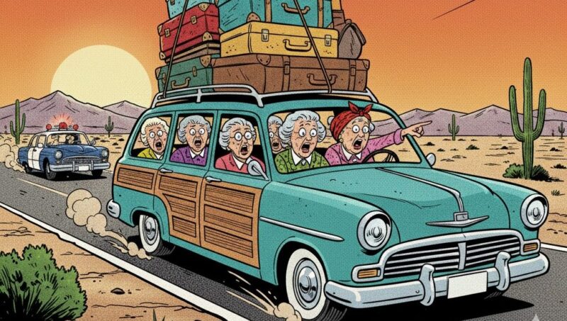 Approaching the car, he notices that there are five old ladies: two in the front seat, and three in the back, wide eyed, and white as ghosts.