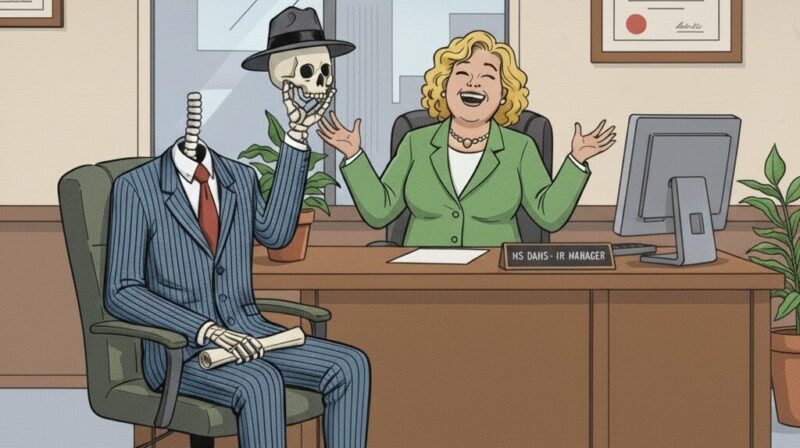 The HR manager smiles faintly. “Well, at least you’re… bone-afide honest.”