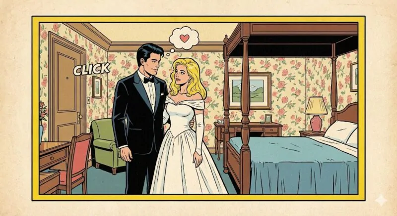 The door to the lavish hotel suite clicked shut, sealing the new husband and wife in the quiet intimacy of their wedding night.