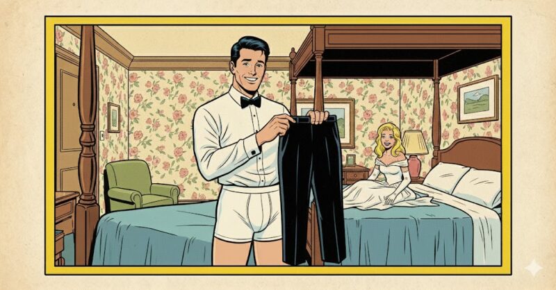 With a playful, triumphant glint in his eye, the groom slipped out of his tailored trousers and held them out to his bride.
