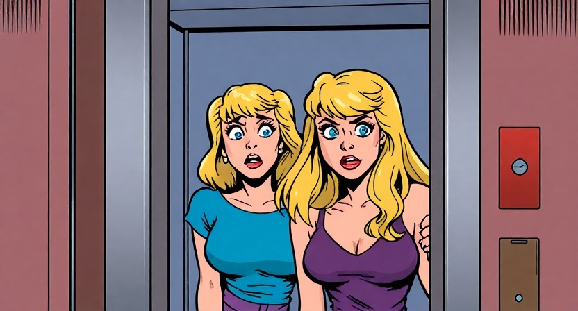 The lights flickered, the elevator lurched to a stop, and silence filled the air except for the faint hum of the emergency light.